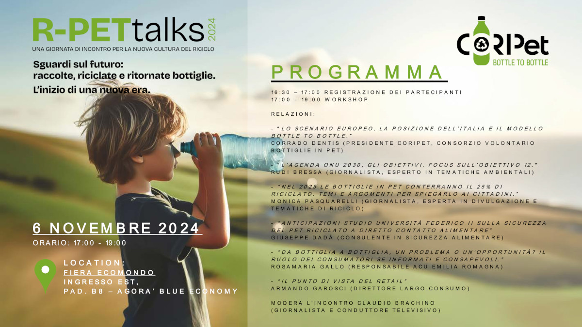 Il 6 novembre 2024 si terrà a Rimini, presso la Fiera Ecomondo al Pad B8 sala Agorà – Blue Economy un workshop sul tema “Il ciclo di vita del PET e del RPET ad uso alimentare prospettive per il 2025